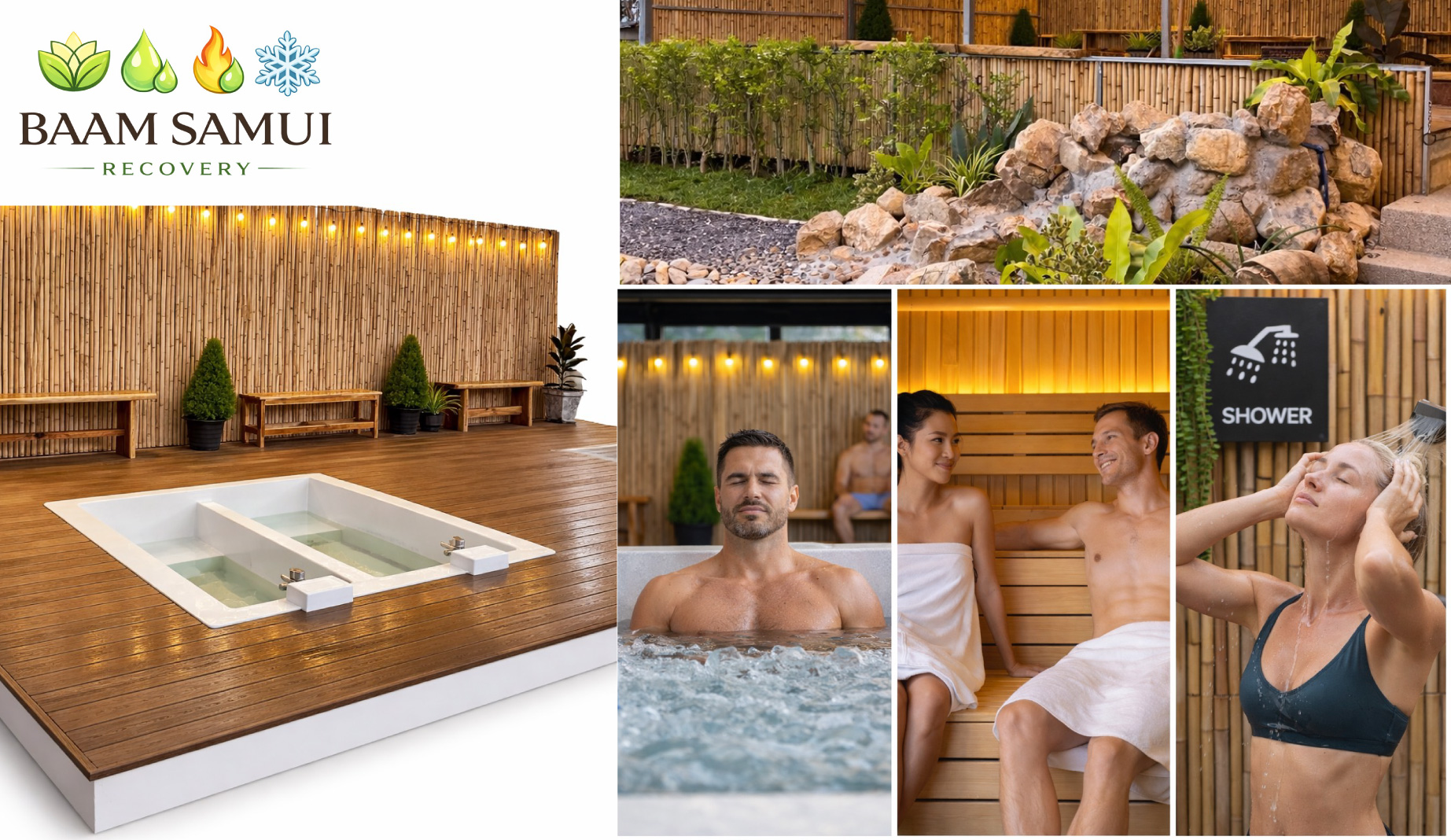 ส่วนของการฟื้นฟูร่างกาย (Recovery Zone) ภายใน Baam Samui ได้ถูกออกแบบขึ้นเพื่อรองรับการพักผ่อนและฟื้นฟูอย่างครบวงจรท่ามกลางบรรยากาศธรรมชาติที่เงียบสงบและผ่อนคลาย เหมาะสำหรับทั้งผู้ที่ออกกำลังกายอย่างจริงจัง และผู้ที่ต้องการดูแลสุขภาพในชีวิตประจำวัน พื้นที่นี้ประกอบด้วยบริการหลัก ได้แก่ Ice Bath, Sauna, Steam Room และ Hot Tub ซึ่งถูกจัดวางอย่างลงตัว เพื่อสร้างประสบการณ์การฟื้นฟูที่สมบูรณ์แบบในหนึ่งเดียว
